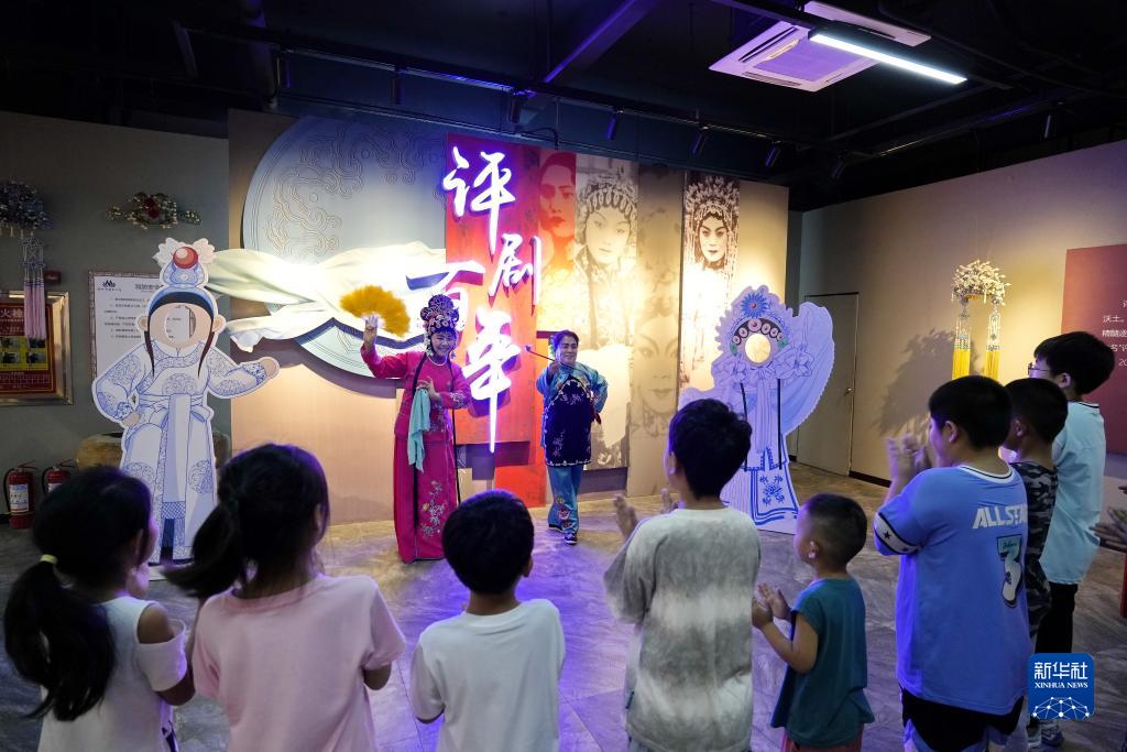 7月21日,在位於河北省灤州市的中國評劇藝術館,戲曲愛好者在為孩子們表演。