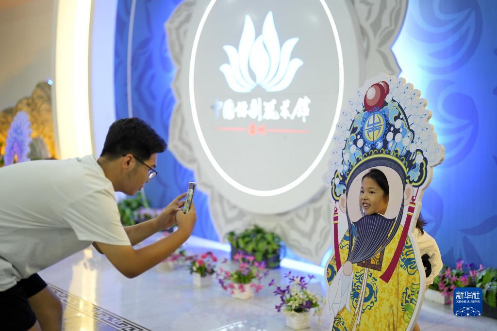 7月21日,在位於河北省灤州市的中國評劇藝術館,家長在給孩子拍照。