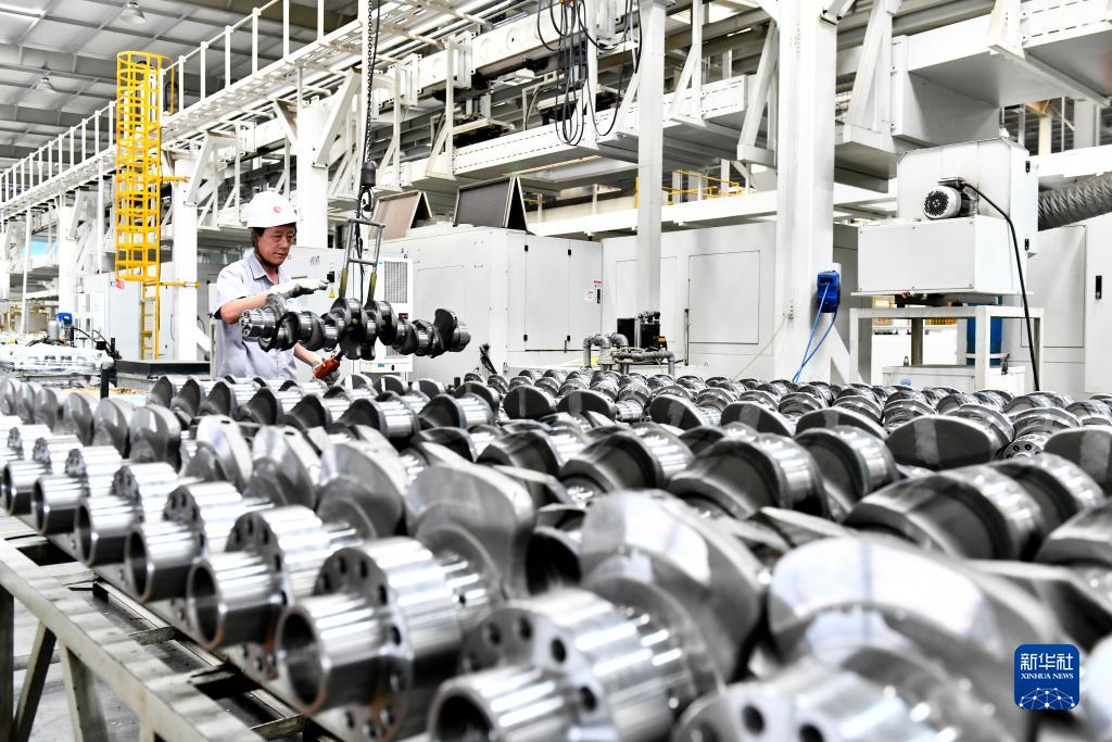 7月21日,在位於威海市文登區的天潤工業技術股份有限公司,工人在吊運曲軸産品。