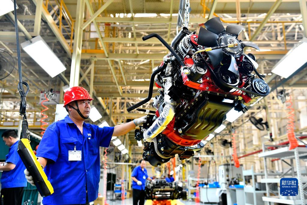 7月21日,在位於威海市文登區的濰柴新能源商用車有限公司,工人在生産線上吊裝發動機。