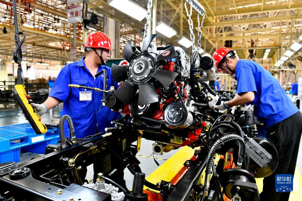 7月21日,在位於威海市文登區的濰柴新能源商用車有限公司,工人在生産線上裝配汽車。
