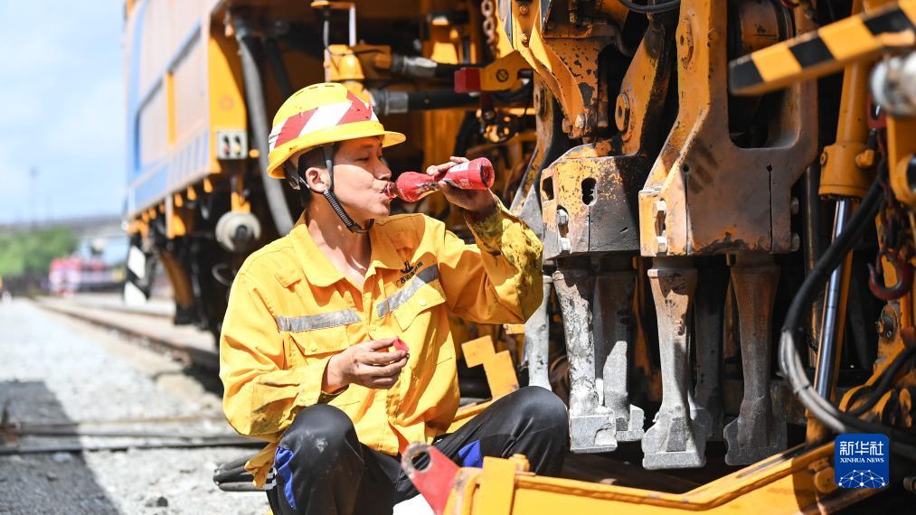 7月21日,國鐵南寧局沿海鐵路公司欽州工務段一名工人飲用冷飲消暑。