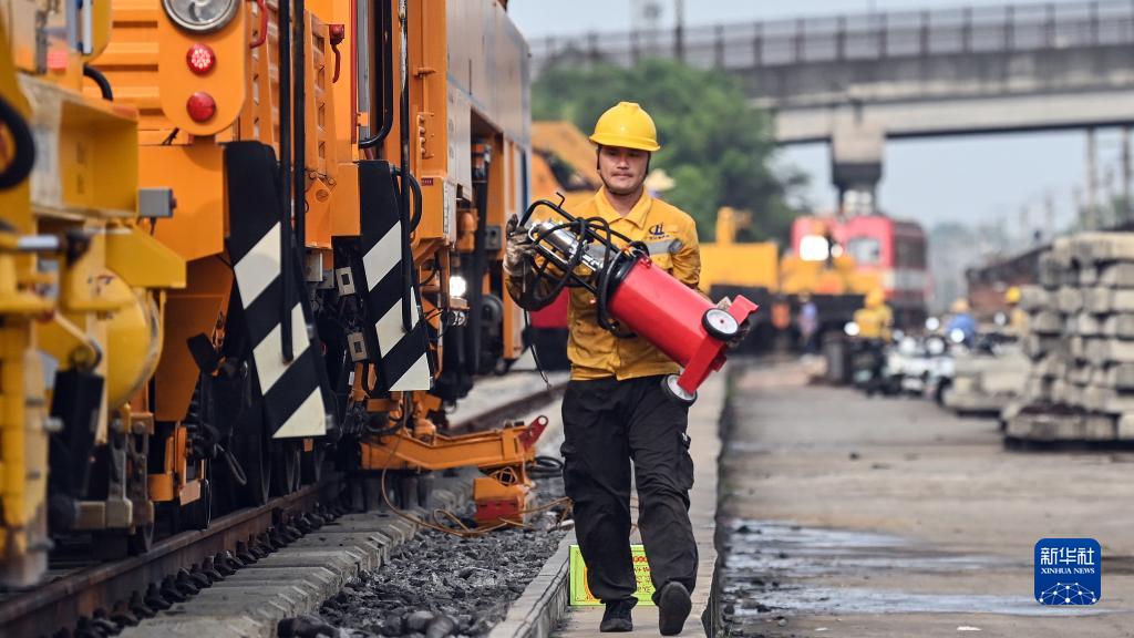 7月21日,國鐵南寧局沿海鐵路公司欽州工務段一名工人在進行維護修理工作。