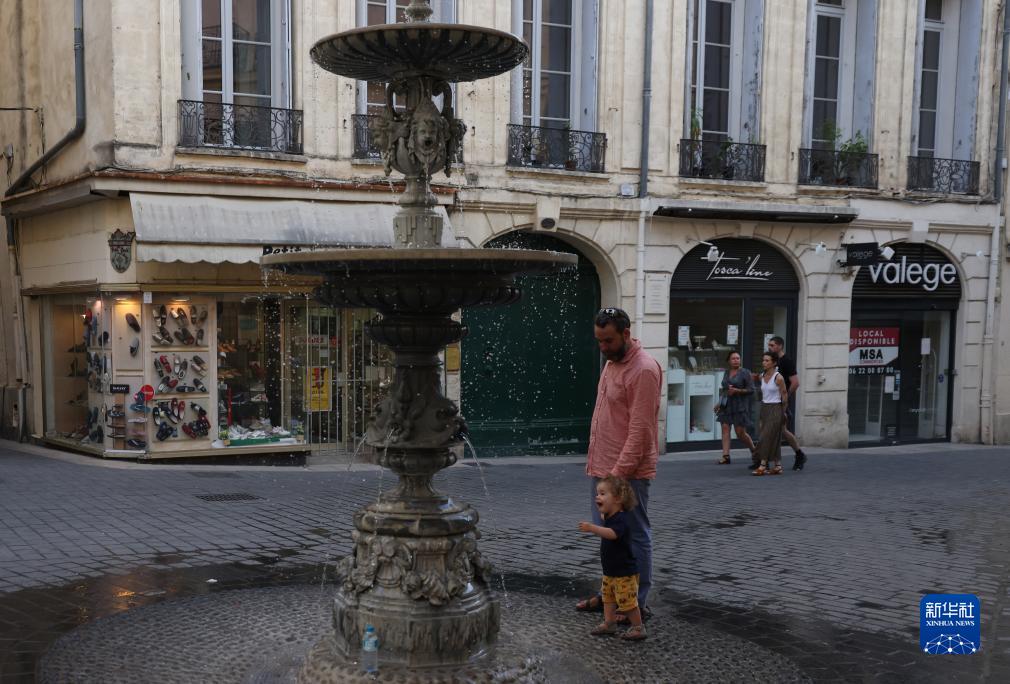 7月17日,一對父子在法國蒙彼利埃街頭玩耍。