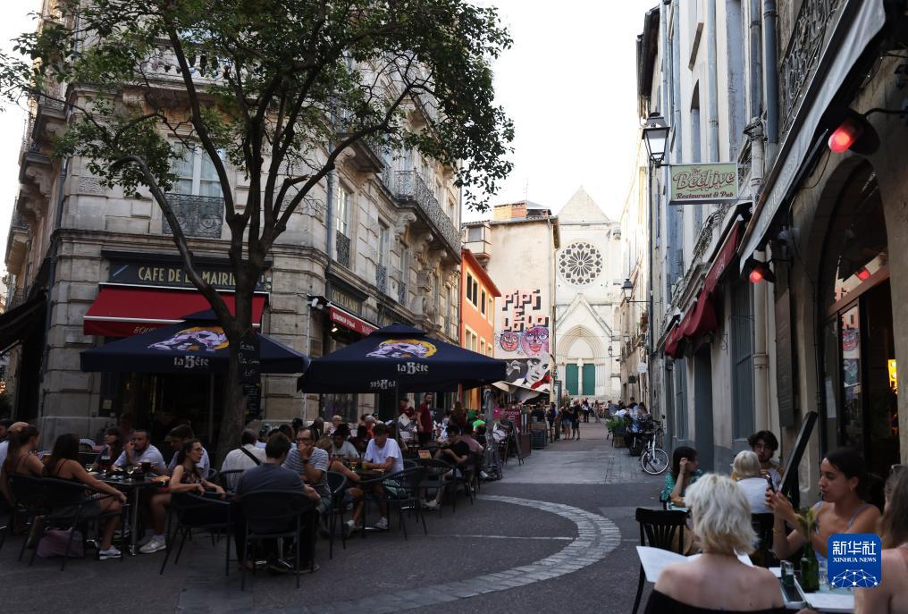 7月17日,人們在法國蒙彼利埃街頭就餐休閒。