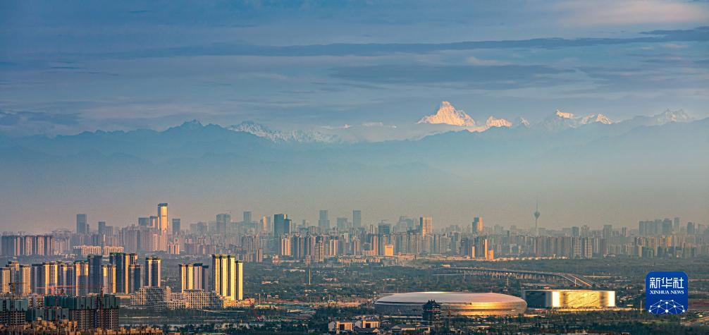 這是成都市區建築和遠處的雪山(2021年6月4日攝)。