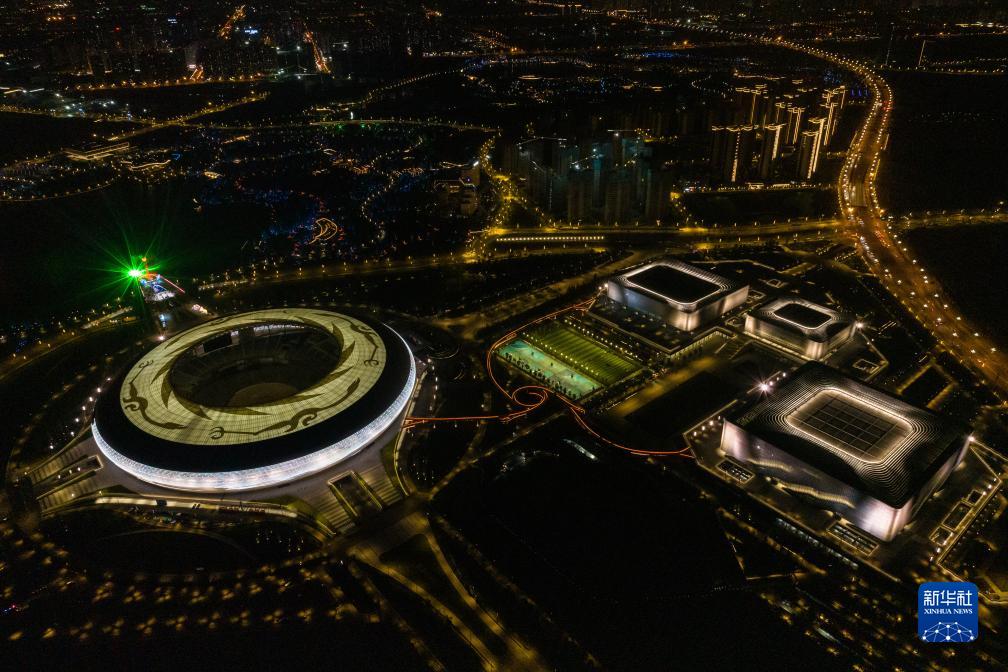 這是成都東安湖體育公園內的第31屆世界大學生夏季運動會開幕式主體育場(左)、主火炬和三個運動場館(4月19日攝,無人機照片)。