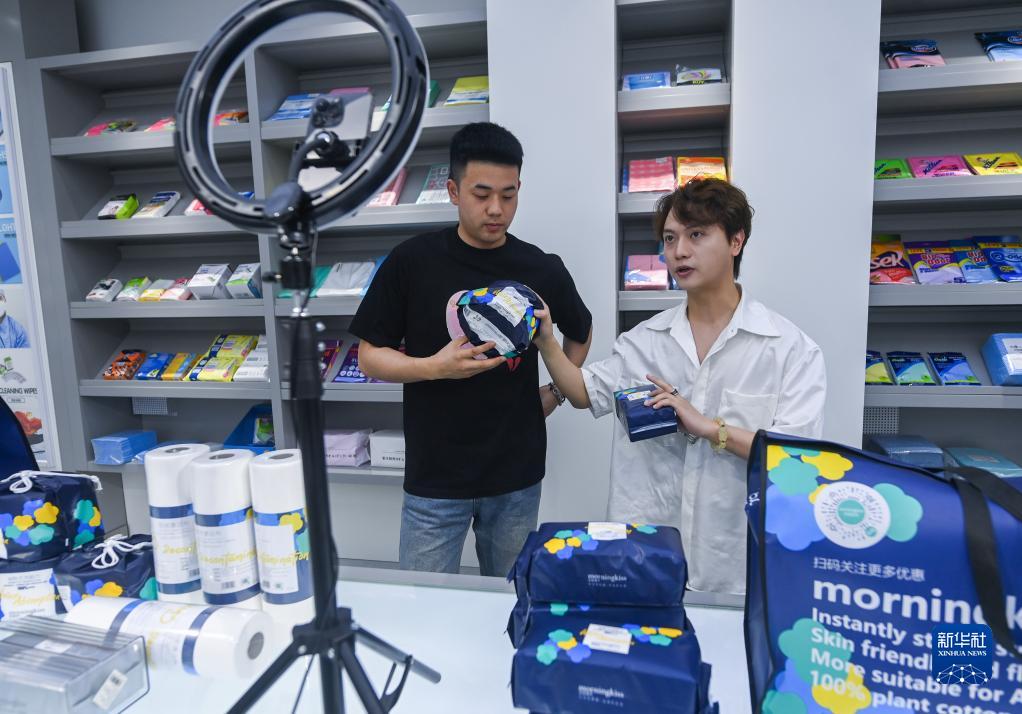 7月21日,在位於杭州市臨安區高虹鎮的浙江晨陽無紡布科技有限公司展廳內,沈屹航(右)在直播推薦産品。沈屹航是“95後”歸國留學生,回到家鄉後,通過電商直播的方式推動無紡布産品拓展新的銷售渠道。