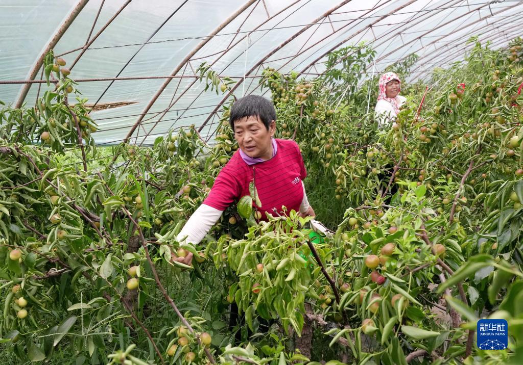 7月21日,河北省黃驊市官莊鄉北排村的果農在大棚內採摘冬棗。