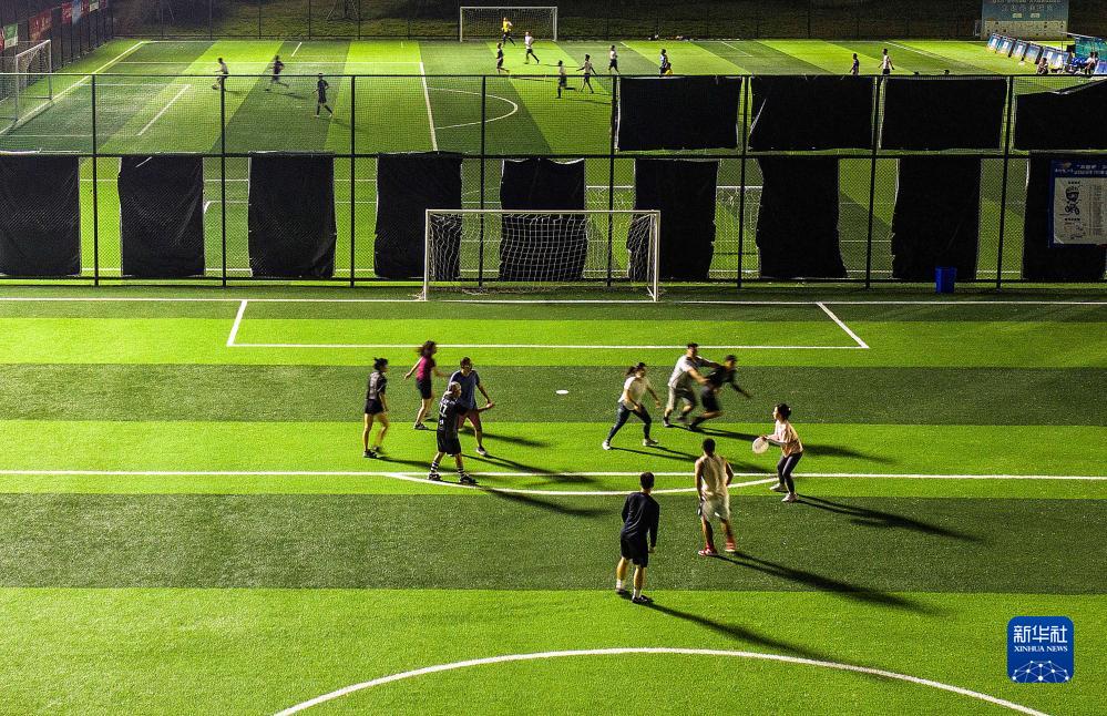 市民在成都市錦江體育公園足球場裏玩飛盤(7月13日攝)。