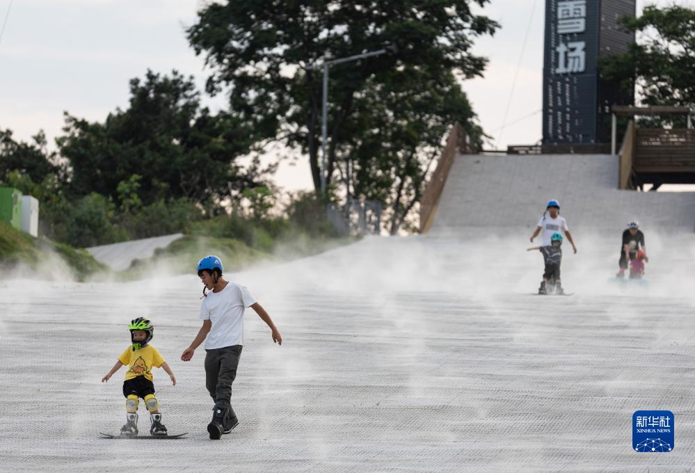 在成都美洲時尚體育公園,小朋友在教練的輔導下練習滑雪(7月18日攝)。
