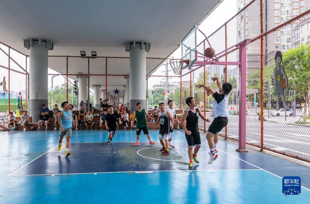 人們在成都市府青路立交橋下的運動空間打籃球(2022年6月12日攝)。
