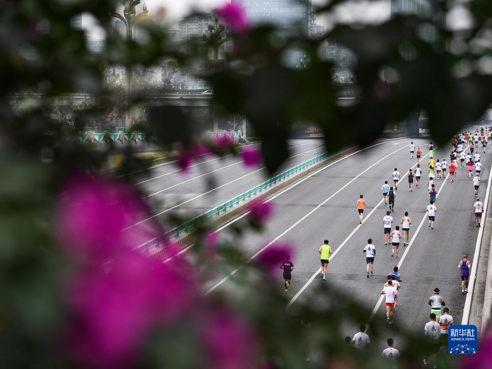在成都天府大道,馬拉松愛好者在比賽中(2022年11月20日攝)。