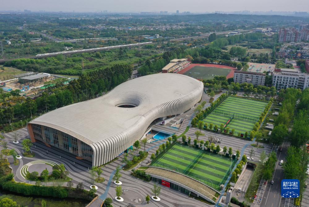 這是成都市新都區的香城體育中心(4月17日攝,無人機照片),這裡將成為成都大運會水球項目的比賽場地。