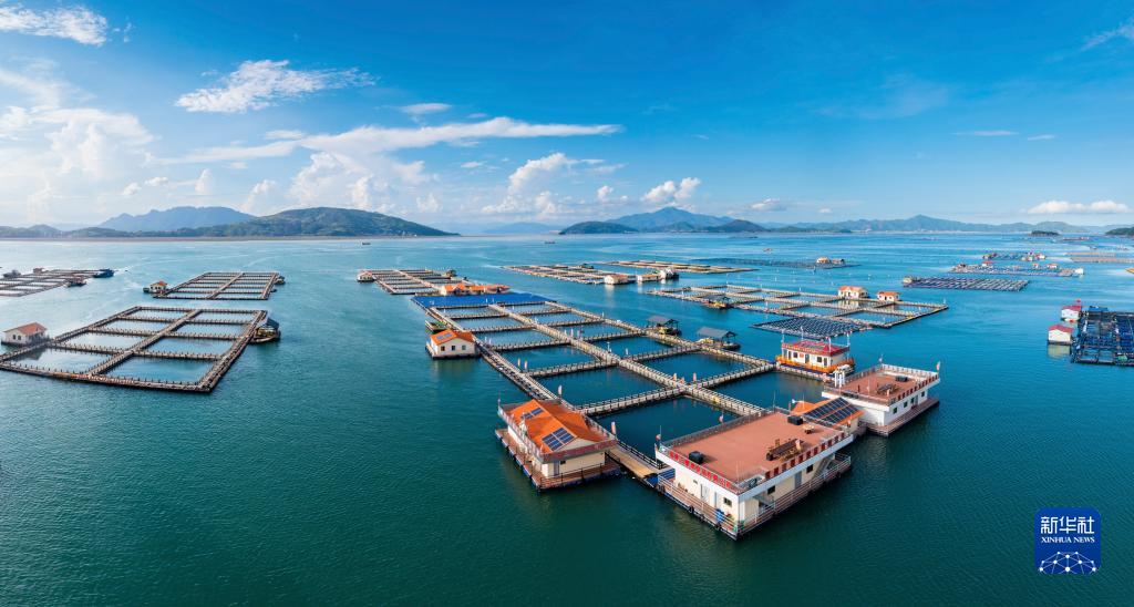 寧德三都澳白基灣海域的新型大黃魚養殖漁排(無人機照片,7月17日攝)。