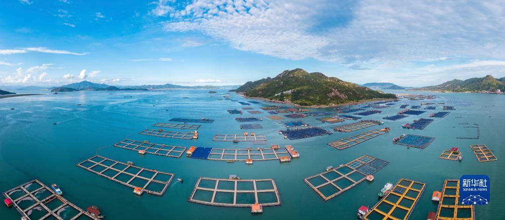 寧德三都澳白基灣海域,新型漁排綿延海上(無人機全景照片,7月17日攝)。