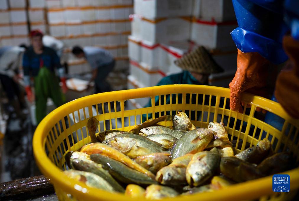 在寧德霞浦下滸海域漁排上拍攝的養殖戶夜捕的大黃魚(2021年11月25日攝)。