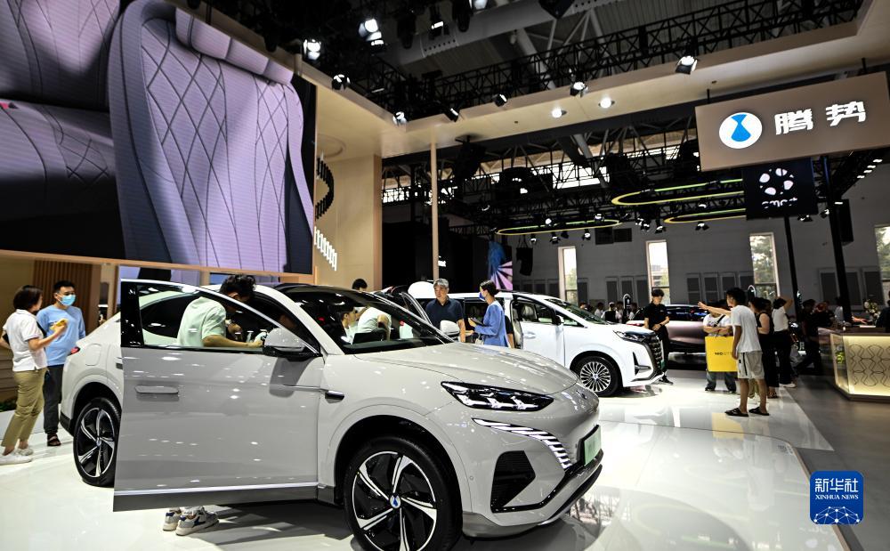 觀眾在長春汽博會的騰勢汽車展位上諮詢體驗新能源汽車(7月17日攝)。
