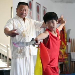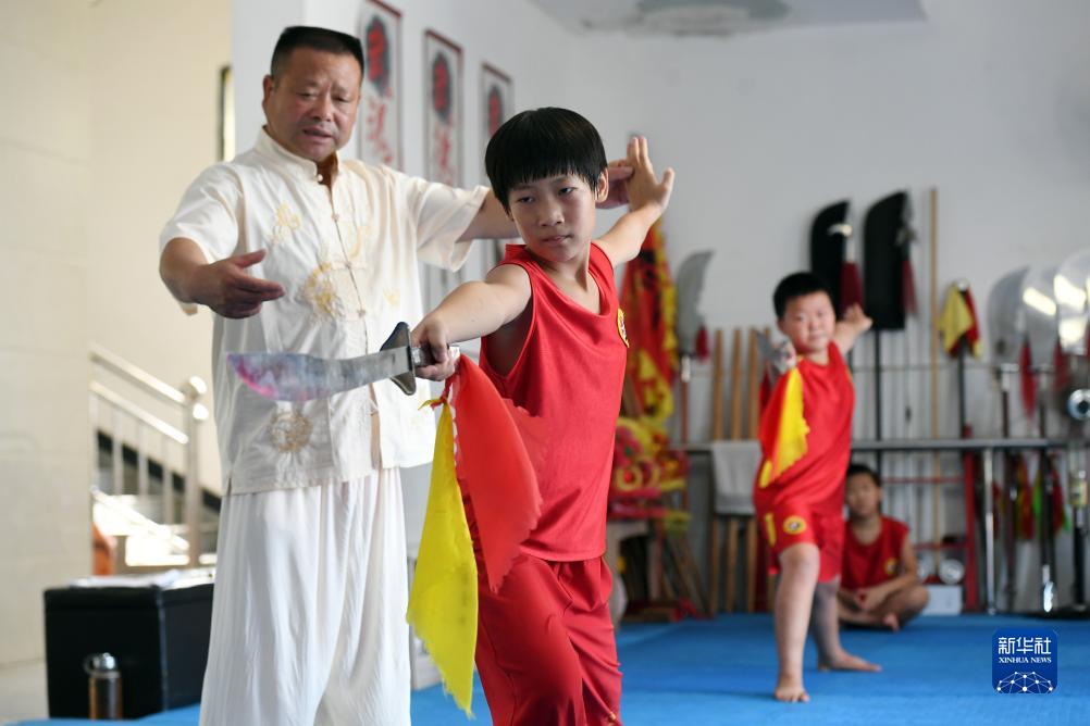 7月21日,在江西省宜春市袁州區南廟鎮白馬村鄉村武館,孩子在武術教練的指導下進行武術器械練習。