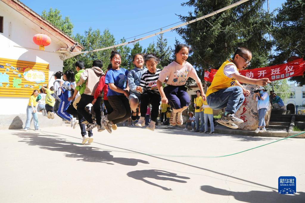 7月21日,在甘肅省定西市安定區內官營鎮東嶽村,孩子們參加鄉村夏令營的跳繩比賽。