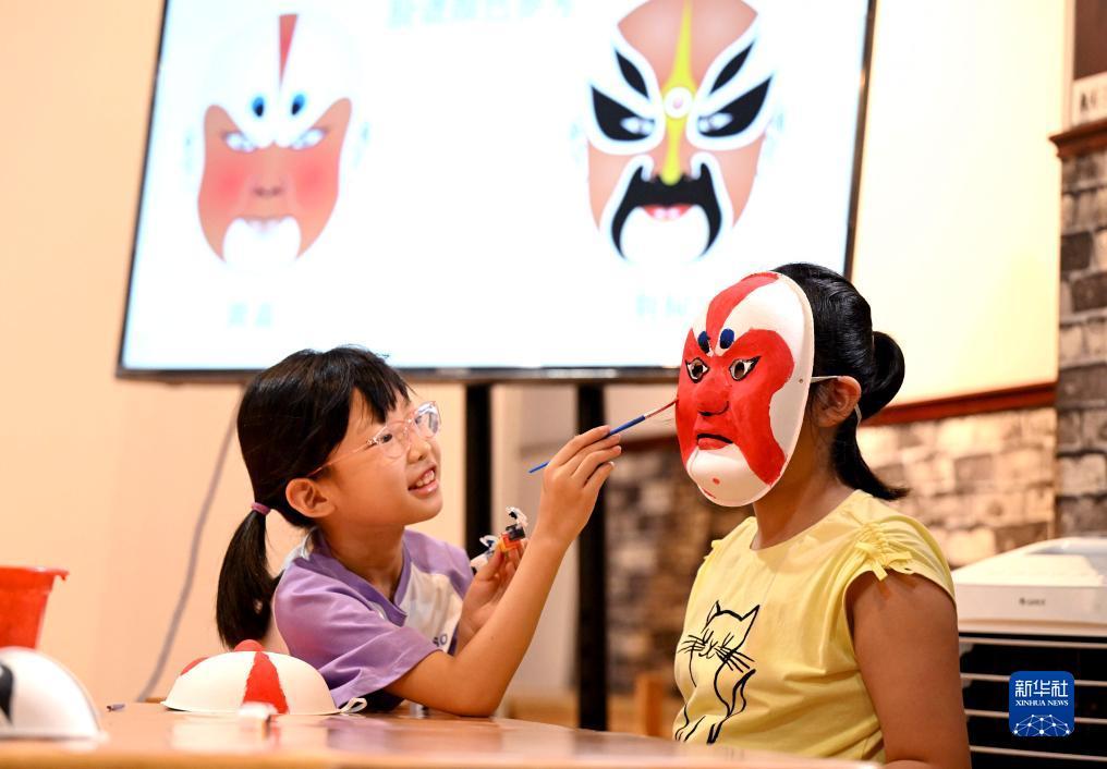 7月21日,小朋友在河北省石家莊市橋西區冀&&文化産業園學習臉譜製作技藝。