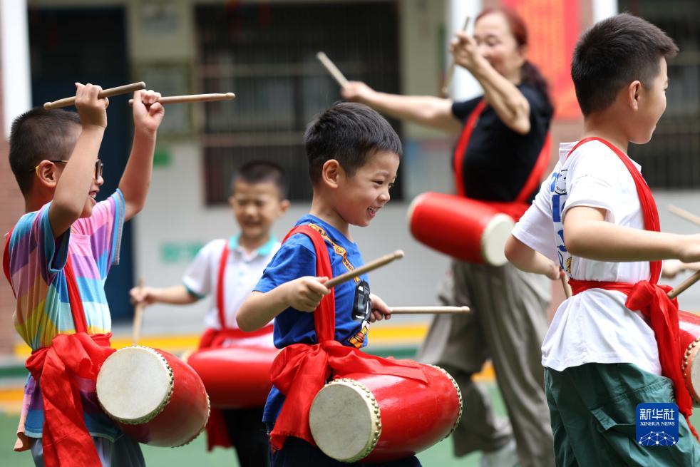 7月21日,在安徽省合肥市琥珀名城小學少年宮,孩子們練習打腰鼓。