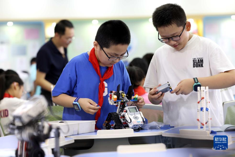 7月21日,在安徽省合肥市郎溪路小學少年宮,孩子們在暑期科創課上組裝機器人。