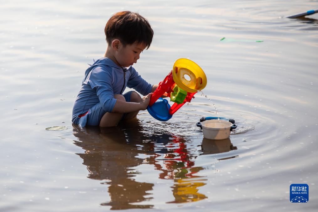 7月21日,孩子在哈爾濱大劇院附近的松花江畔玩耍。