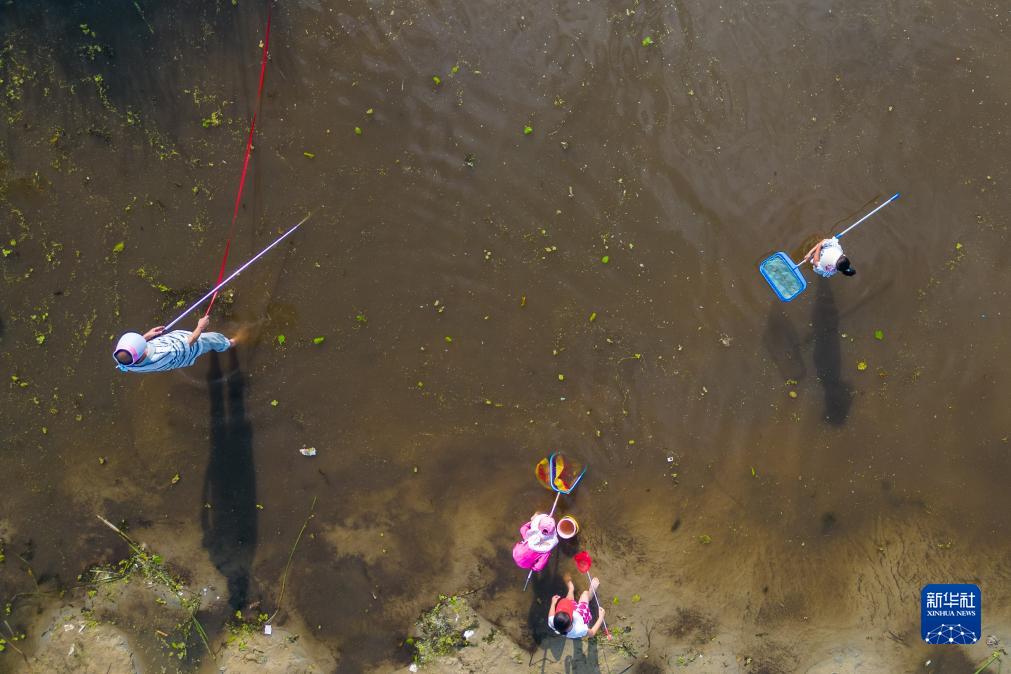 7月21日,人們在哈爾濱大劇院附近的松花江畔游玩(無人機照片)。