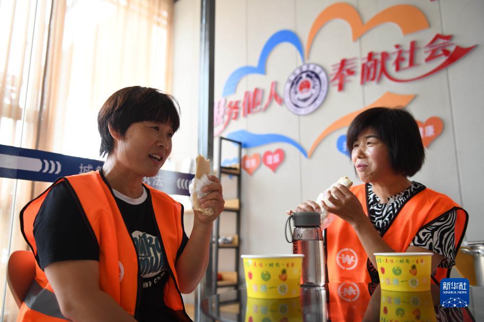 7月21日,山東省臨沂市郯城縣環衛工在“愛心驛站”就餐納涼。
