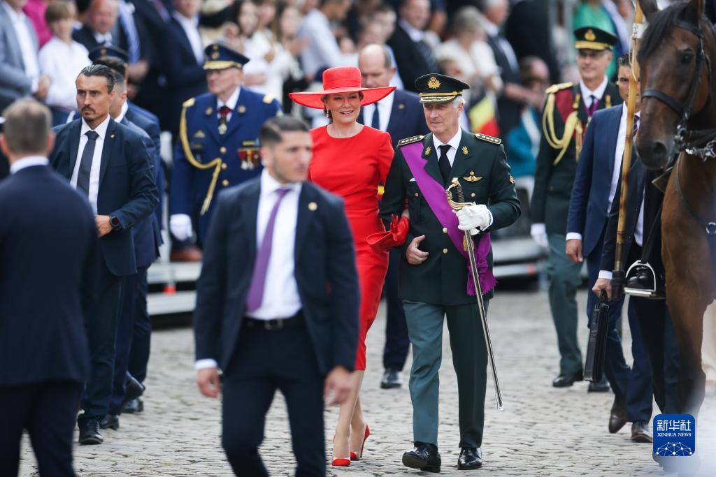 7月21日,比利時國王菲利普、王后瑪蒂爾德在比利時布魯塞爾出席國慶日閱兵式活動。