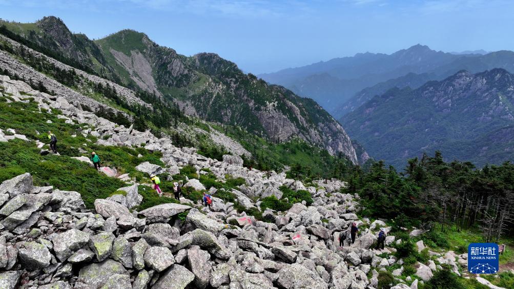 陜西朱雀國家森林公園內,游人在向峰頂攀爬(7月21日攝,無人機照片)。