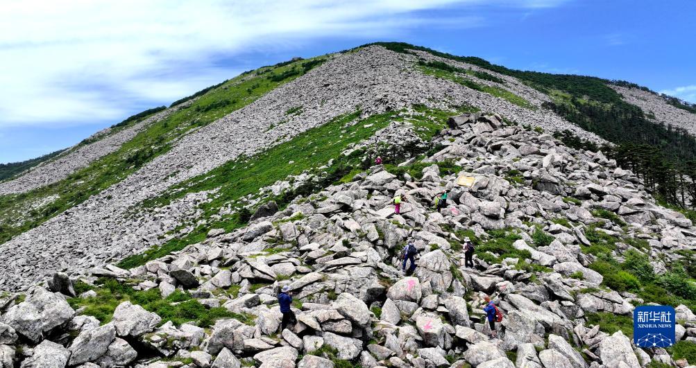 陜西朱雀國家森林公園內,游人在向峰頂攀爬(7月21日攝,無人機照片)。