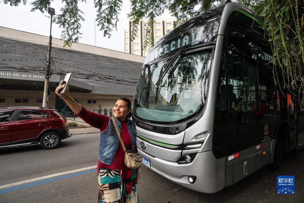 7月12日,在巴西聖保羅州聖若澤杜斯坎普斯,游客與比亞迪純電動大巴合影。