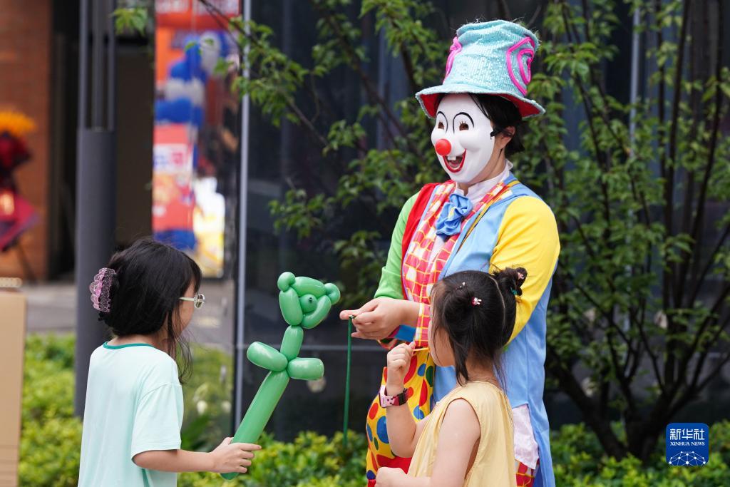7月21日,在安徽省合肥市瑤海區車橋新界文創街區,馬戲團成員與小朋友互動。