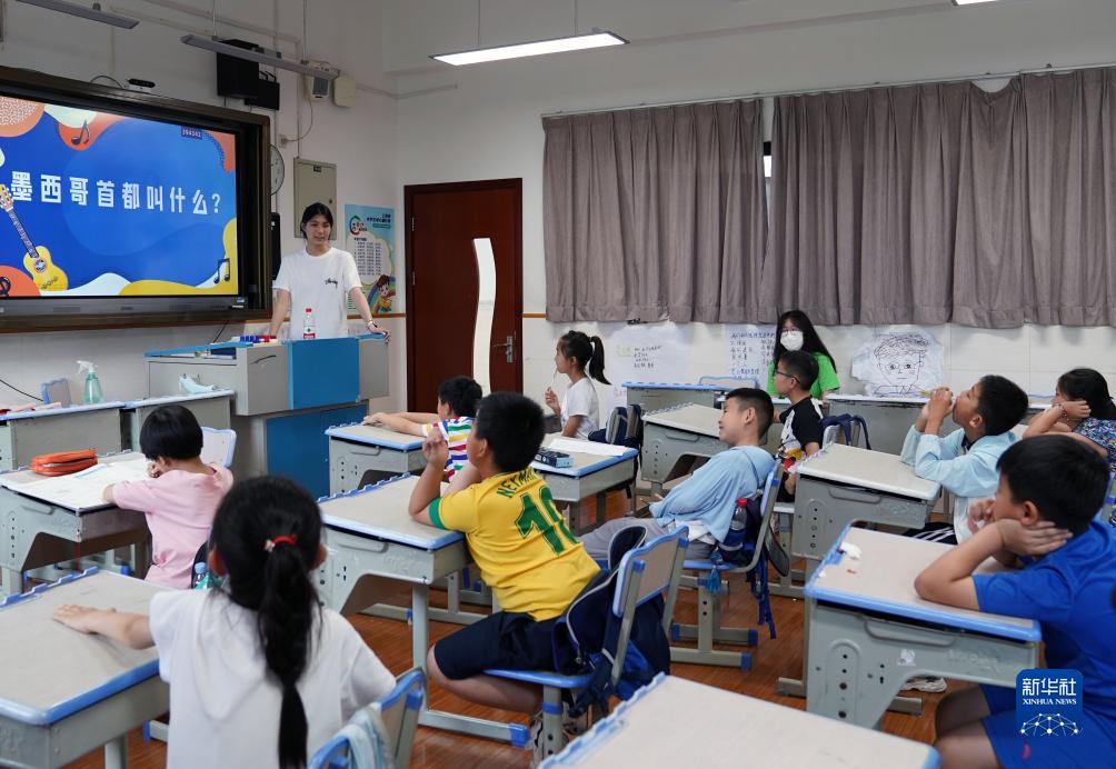 7月19日,在萬里城實驗學校,小學生愛心暑托班“新業態新就業群體子女專班”的孩子們在“21天環游世界”特色課堂上,了解世界各國的地理常識並進行互動游戲。