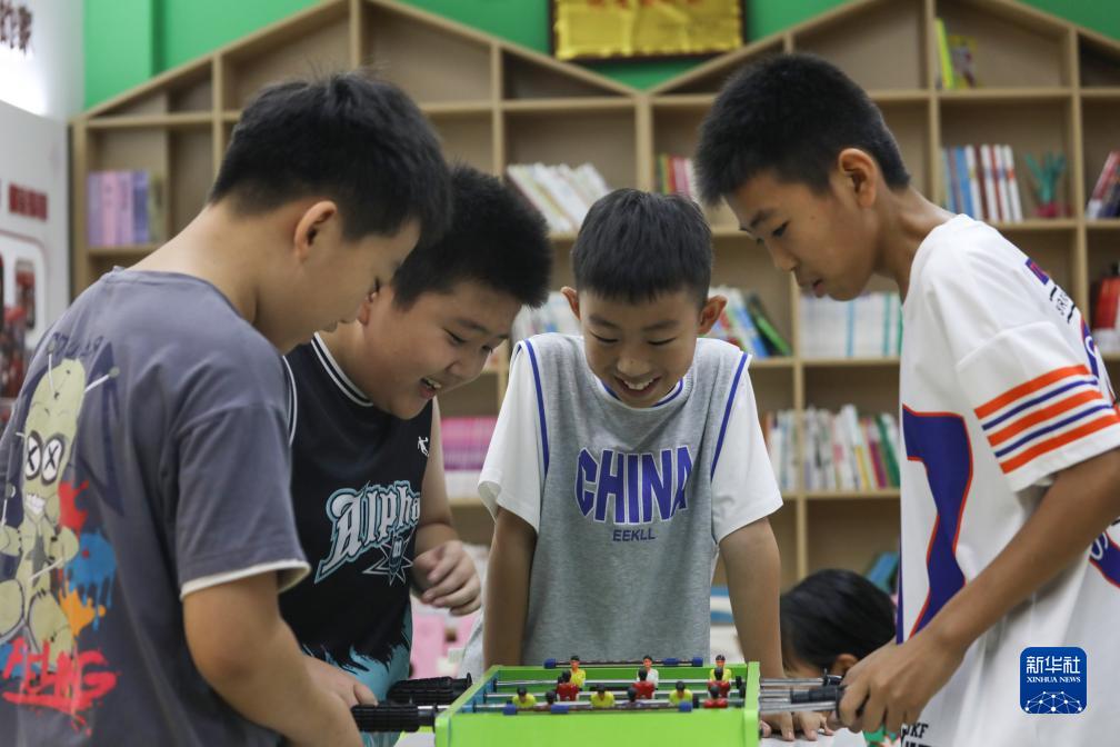 7月21日,幾名小學生在山東省樂陵市市中街道南鑫社區新時代文明實踐站暑期託管班進行桌式足球游戲。