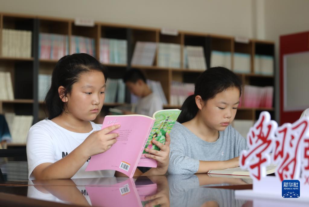 7月20日,小學生們在山東省樂陵市楊安鎮千都苑新村新時代文明實踐站圖書室看書。