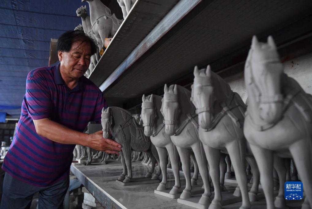 7月20日,在南石山村一家生産企業的車間裏,唐三彩藝人張二孬在整理做好的泥胎。