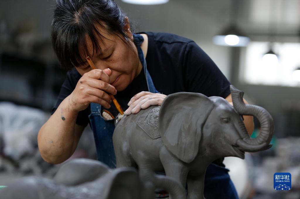 7月19日,在南石山村一家唐三彩生産企業的車間裏,工人在加工泥胎。