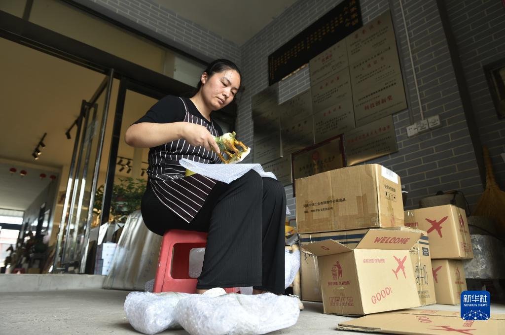 7月20日,南石山村一家唐三彩生産企業的工人在打包唐三彩作品準備外銷。