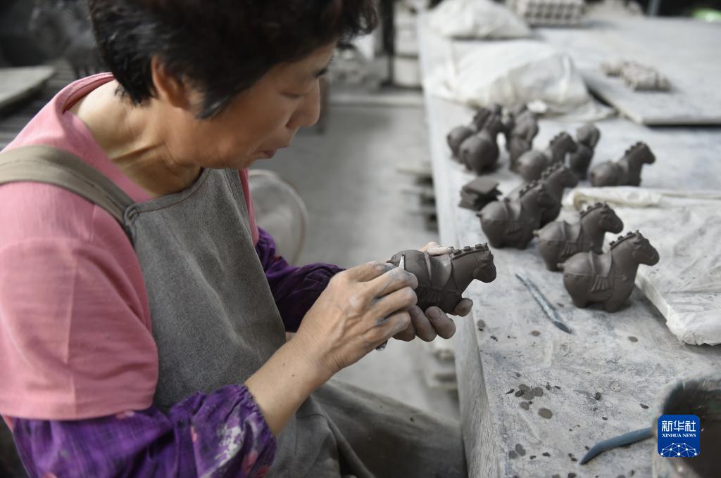 7月20日,在南石山村一家唐三彩生産企業的車間裏,工人在加工泥胎。