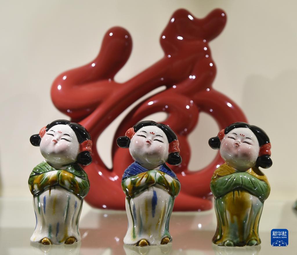 這是7月19日在南石山村一家生産企業的展廳裏拍攝的唐三彩作品。