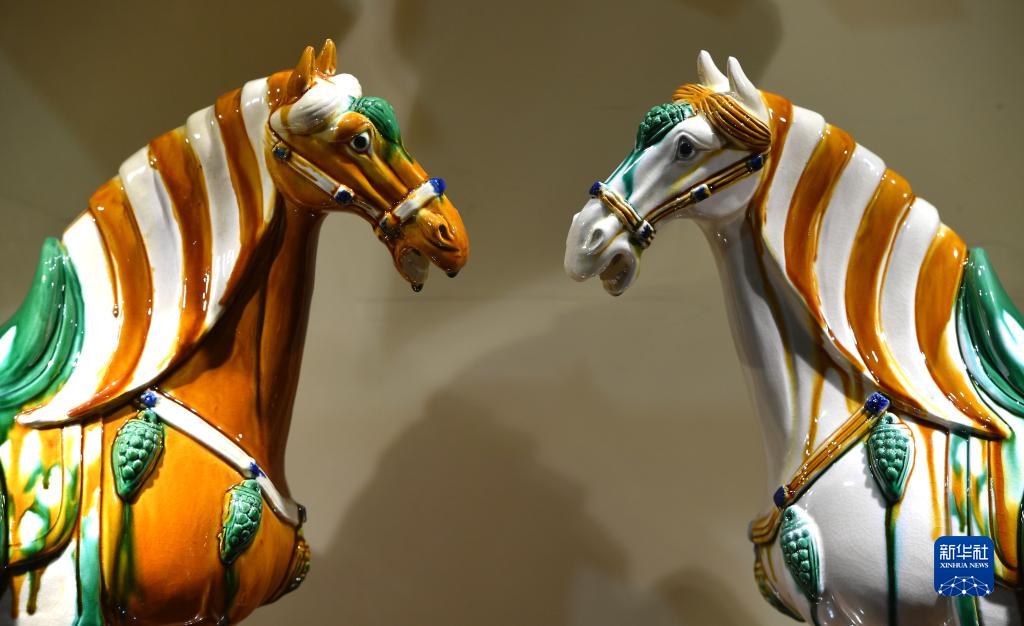 這是7月19日在南石山村一家唐三彩生産企業的展廳裏拍攝的唐三彩作品。
