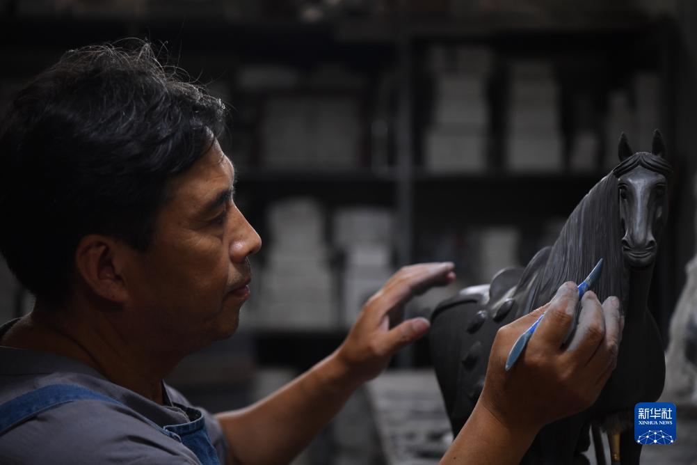 7月19日,在南石山村一家生産企業的車間裏,唐三彩藝人高順旺在雕刻泥胎。