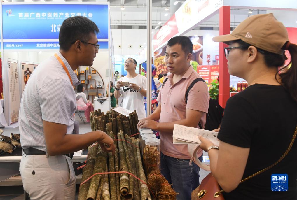 7月22日,在廣西南寧國際會展中心,人們在中醫藥産業展覽現場交流。