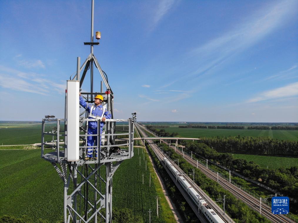 7月13日,位於肇東市的哈齊高鐵12號基站鐵路通信鐵塔上,魏巍進行維護鐵路通信設備作業(無人機照片)。