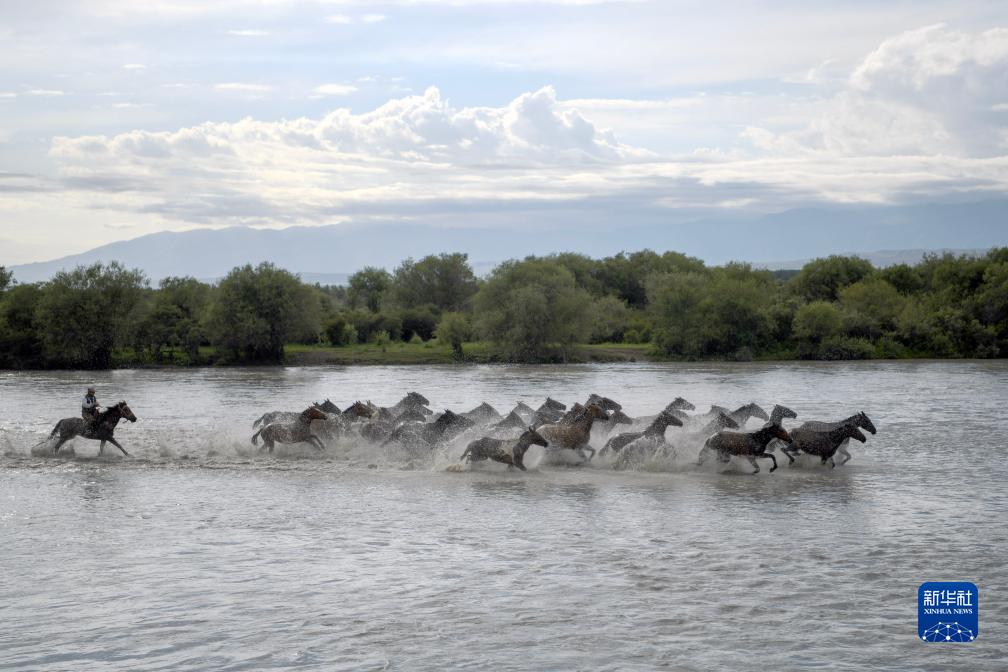 這是7月17日在新疆伊犁哈薩克自治州昭蘇縣濕地公園景區拍攝的“天馬浴河”景觀(無人機照片)。