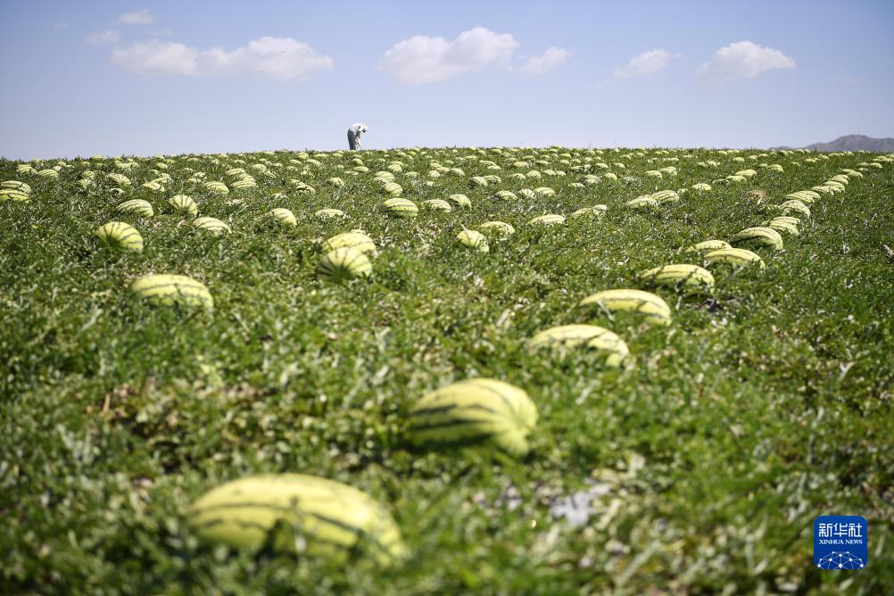 農戶在中衛市沙坡頭區香山鄉收穫硒砂瓜(7月21日攝)。
