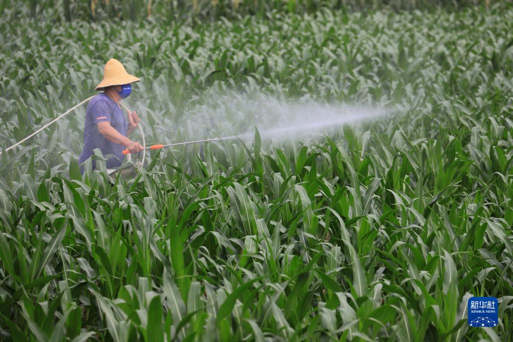 7月22日,在河南省焦作市溫縣黃莊鎮東宋莊村,農民為玉米噴灑葉面肥。